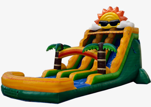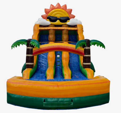 Turn your event into the ultimate summer party with the Beach Party Double Lane Water Slide! ๐ดโ๏ธ Featuring bright tropical colors, palm trees, and a cool sun design, this slide brings beach vibes right to your backyard.